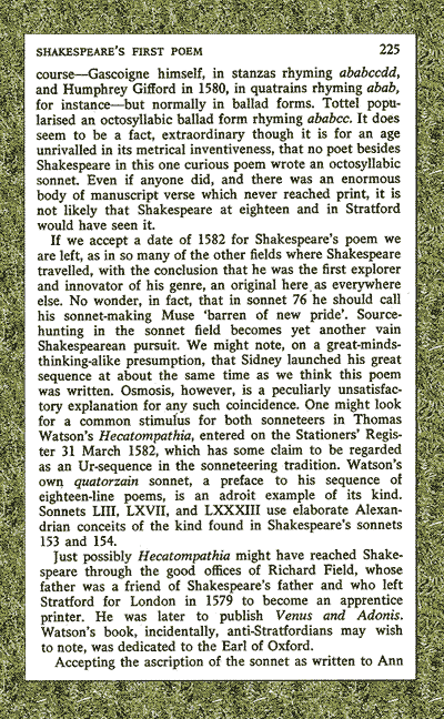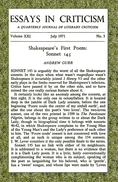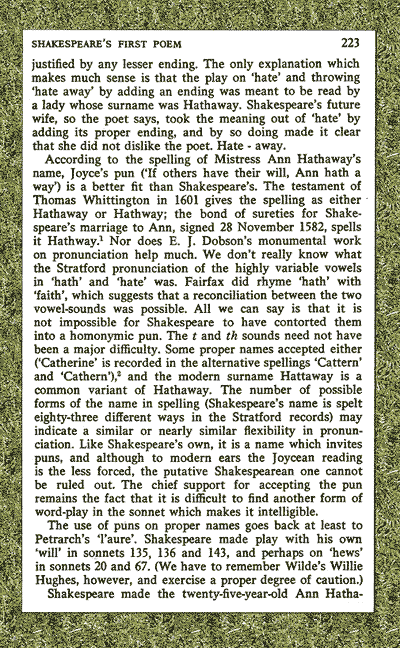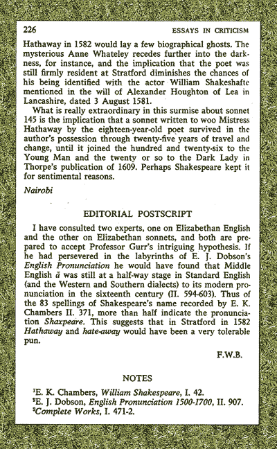 The question of the pun on Ann Hathaways name has given Professor Gurrs article as well as the Editorial Postscript by F. W. B. (Frederick W. Bateson) a significance it did not have when it was first published.